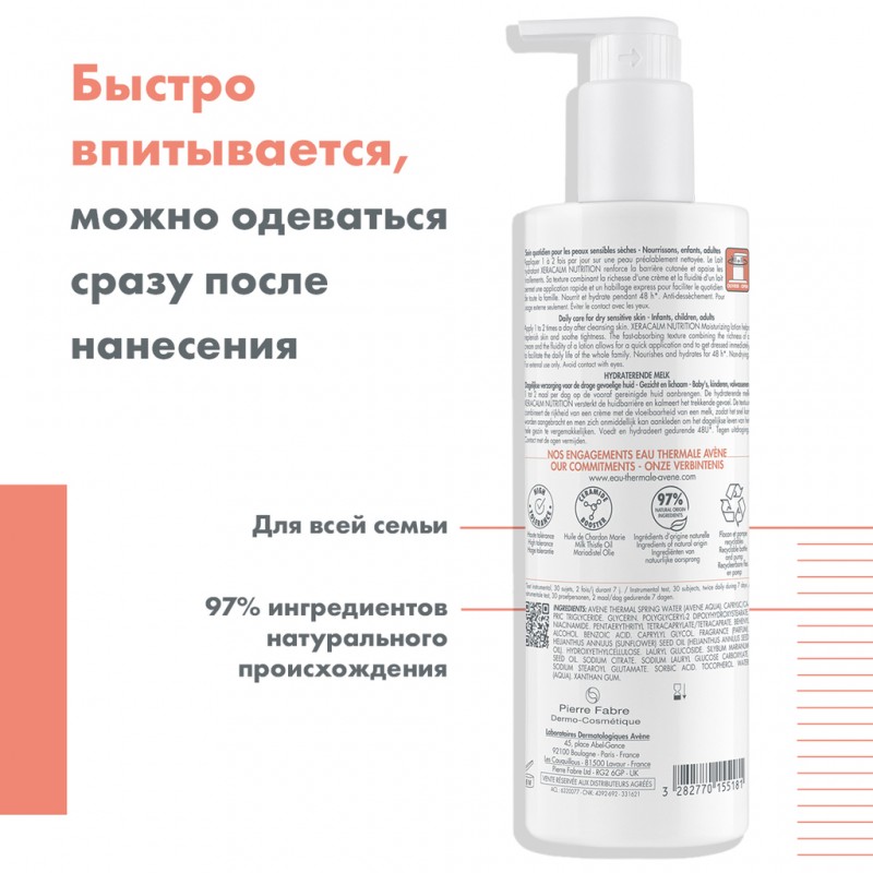 AVENE XeraCalm Nutrition — увлажняющее и питательное молочко для ежедневного ухода за чувствительной и сухой кожей всей семьи, включая младенцев от 1 месяца. Средство идеально подходит для лица и тела, помогает укрепить кожный барьер, успокаивает раздражение и обеспечивает длительное увлажнение до 48 часов.