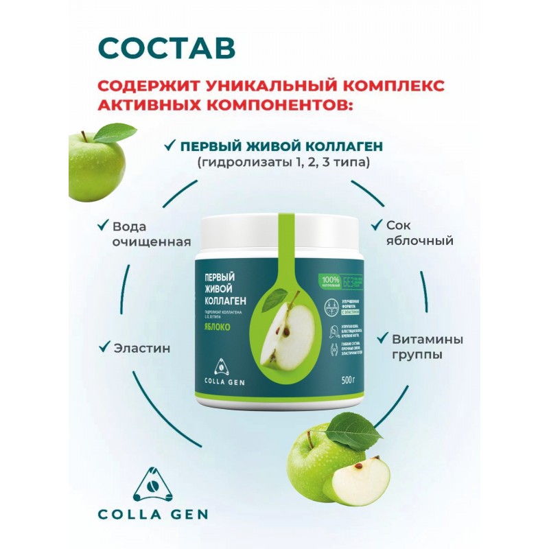 Уникальный, легкоусваиваемый, пищевой bio-комплекс COLLA GEN ЯБЛОКА доставляет жизненно важные микроэлементы в клетки и тем самым запускает процессы восстановления и оздоровления организма. Имеет улучшенную формулу коллагена с эластином для гибких суставов, эластичных связок, густых волос, упругой кожи, крепких ногтей. Запатентованный производственный процесс, а также качество и свойства продукта подтверждены клиническими испытаниями, международными сертификатами ISO и HACCP. Без добавления сахара, ГМО, красителей, глютена. 100% натуральный сок вишни в составе. Подходит всем членам семьи – детям, подросткам, взрослым, пожилым. Абсолютно безопасен для особых категорий людей – аллергиков, беременных и кормящих. ЖИВОЙ КОЛЛАГЕН – это выбор более 200 российских звезд, авторитетных врачей и спортсменов!