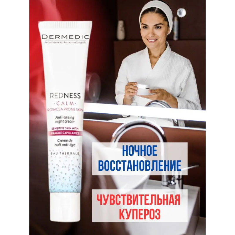 DERMEDIC REDNESS CALM Ночной крем против морщин разработан специально для ночного ухода за гиперреактивной сосудистой кожей и на ранних стадиях розацеа. Вот основные характеристики и действия продукта: