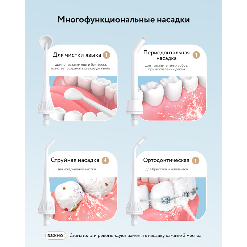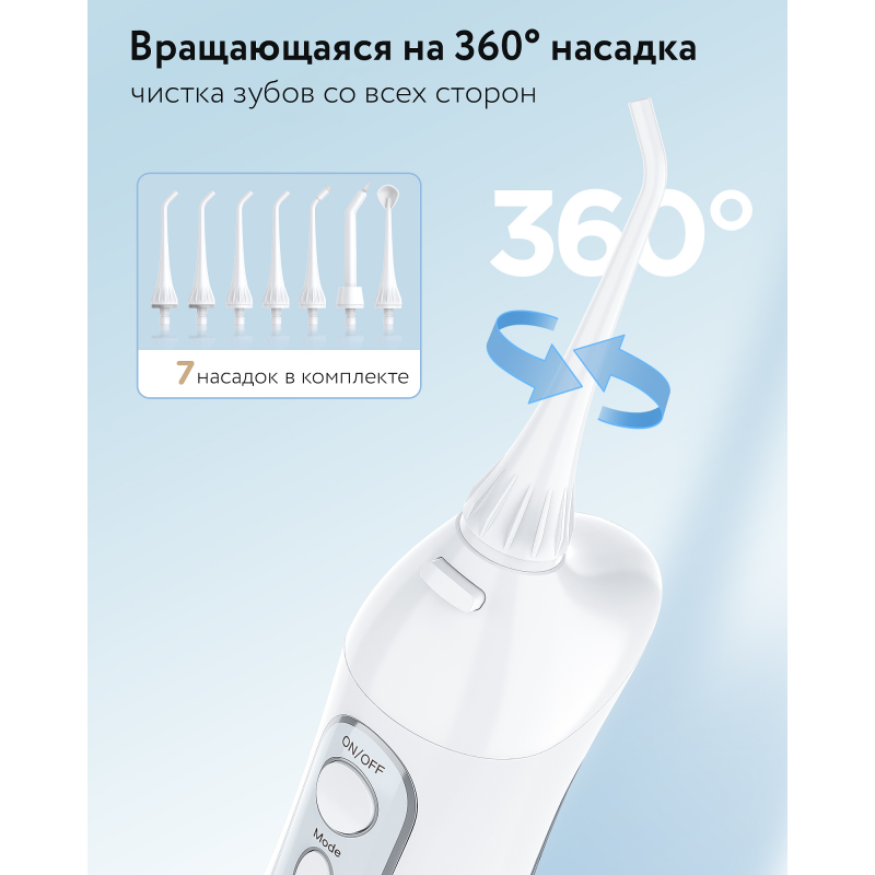 В комплект входят 7 насадок, которые рассчитаны на длительное использование. Удобное поворотное сопло позволяет эффективно очищать каждый участок ротовой полости.