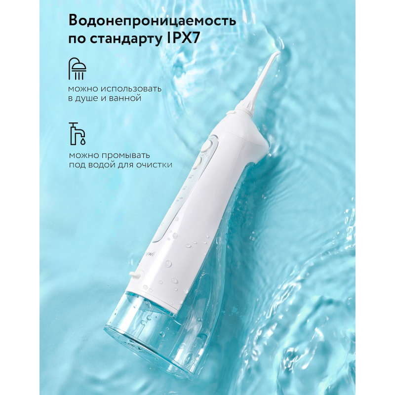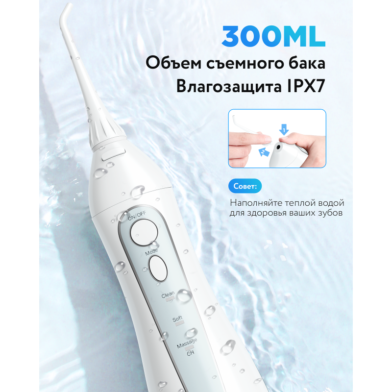 Ёмкость съемного резервуара для воды — 300 мл, чего достаточно для одной полноценной процедуры. Заряжается прибор через USB-кабель за 4 часа, одного заряда хватает примерно на 30 дней. Корпус водонепроницаем, что позволяет использовать ирригатор даже в душе. Для надежной герметичности используется двойной уплотнитель.