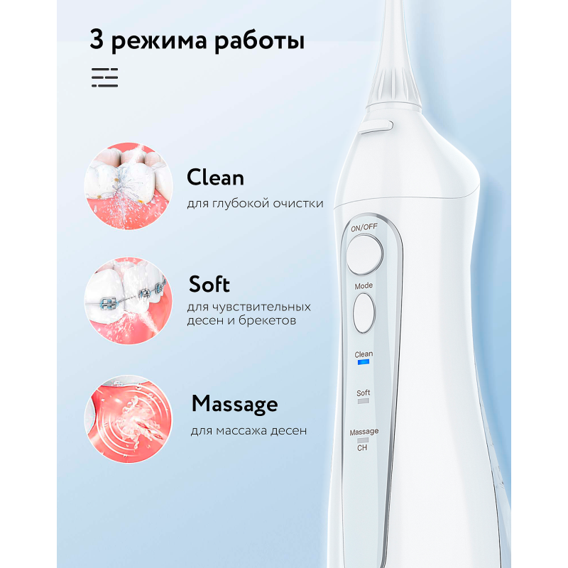 Обычные зубные щетки не способны эффективно очищать труднодоступные участки между зубами. В этом случае отличным решением станет портативный ирригатор, который справляется с задачей деликатной и глубокой чистки. Он также отлично подходит для ухода за брекетами, коронками и съемными протезами.