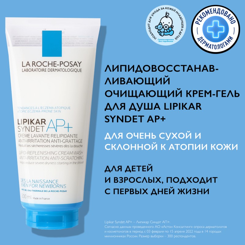 La Roche-Posay Lipikar Syndet AP+ Крем-гель для тела, 200 мл - крем-гель специально разработан для мытья новорожденных, младенцев, детей и взрослых с кожей, склонной к атопической экземе (дерматиту). Если ваша кожа чувствительная, склонная к зуду, или если вы ищете безопасное средство для ухода за кожей головы вашего ребенка, то La Roche-Posay Lipikar Syndet AP+ Gel Lavant - ваше решение.