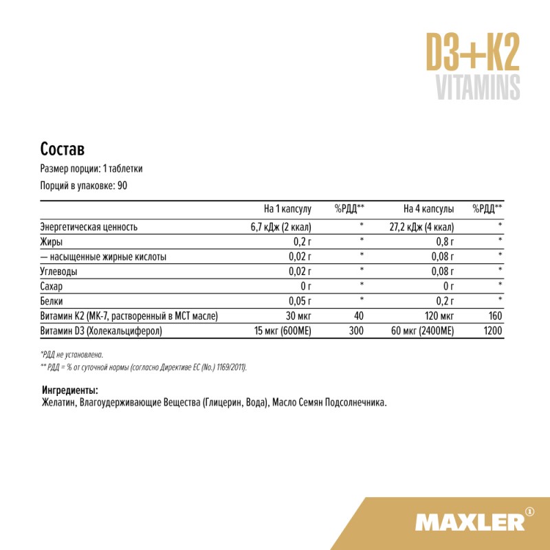 Цена Maxler Д3+К2 капсулы по 0,23г БАД, 90шт
