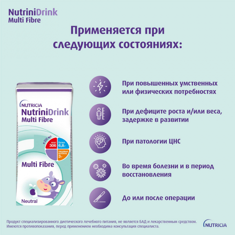 Специализированный продукт детского диетического лечебного питания для детей старше 1 года, жидкая готовая к употреблению, высококалорийная смесь для энтерального питания “НУТРИНИДринк с пищевыми волокнами» (NutriniDrink Multi Fibre») с нейтральным вкусом. Высококалорийный, полноценный, содержащий пищевые волокна продукт для питания детей в возрасте от 1 года и