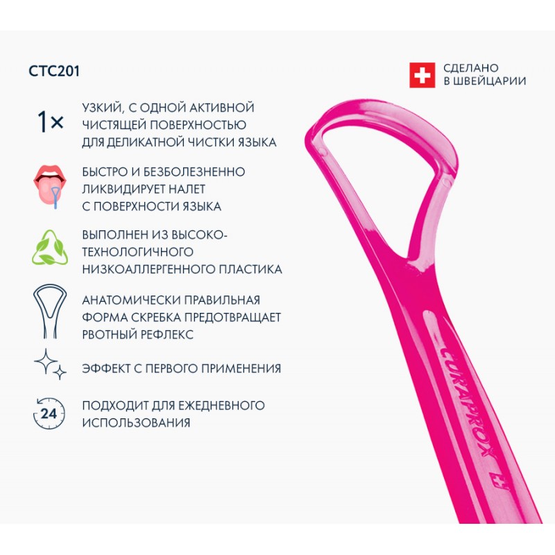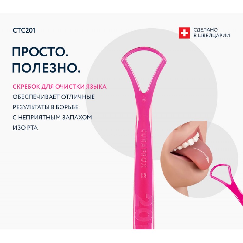 - Эффективная чистка: Специально разработанный скребок Curaprox быстро и безболезненно удаляет налет с поверхности языка.